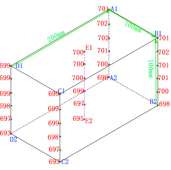 温场图 | 在700℃恒温时的温场图 A1BB2A2距离炉膛后墙的距离是5cm B1B2C2C1距离炉膛右墙的距离是5cm C1C2D2D1是炉门方向,距离炉门的距离是5cm A1A2D2D1距离炉膛左墙的距离是5cm A1B1C1D1距离炉顶的距离是5cm A2B2C2D2距离炉低的距离是5cm E1、E2分别是上、下面的中点 此数据仅代表的测试的这一台,不代表该型号的其它炉子,每台炉子在装配生产的过程中会有微小差异,温场也会有微小的差异 | ||||